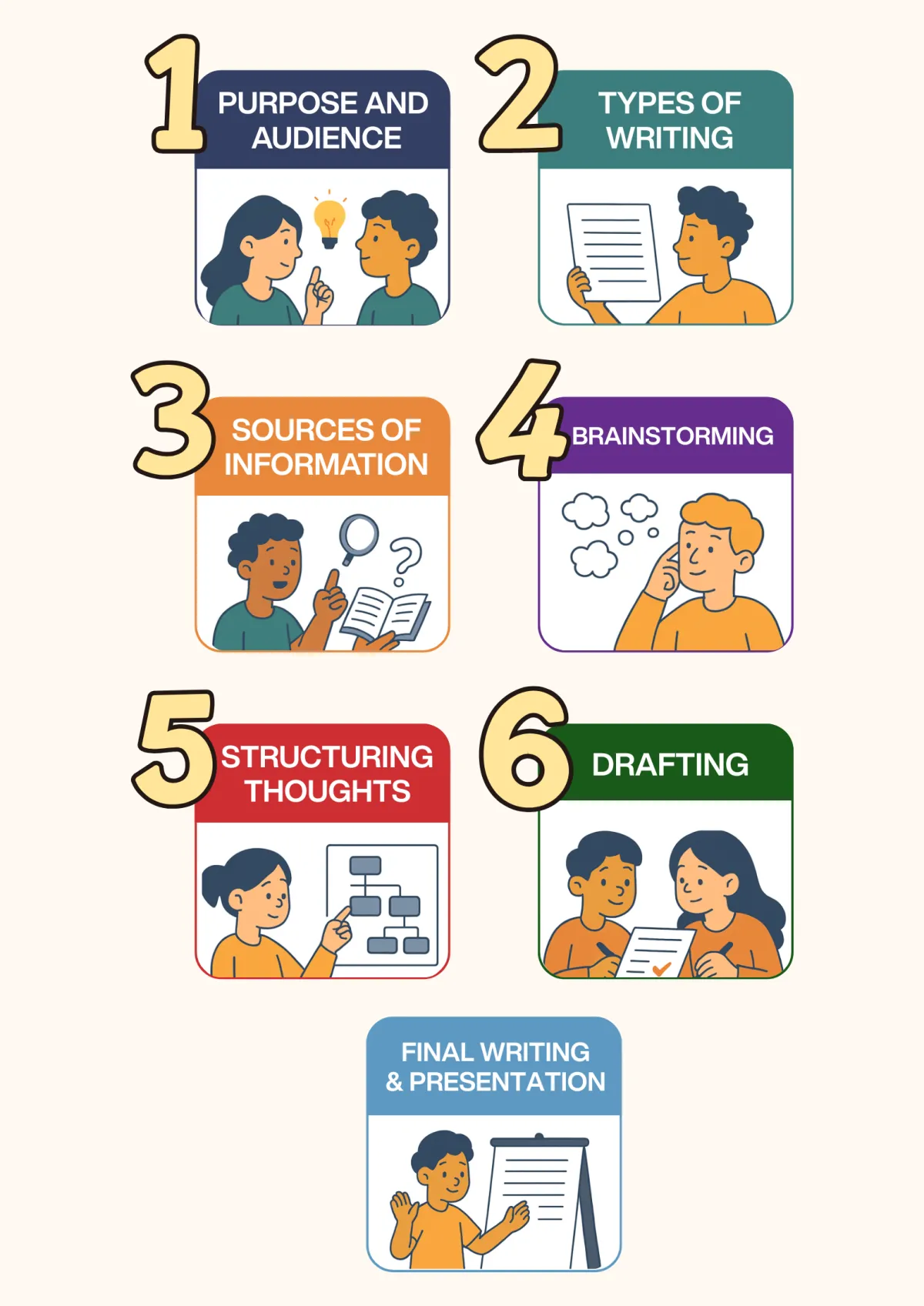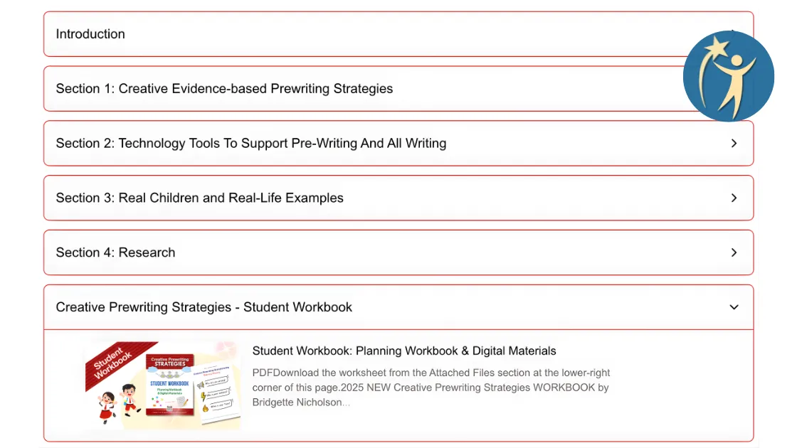 A workbook that can be printed out as a visually engaging guide for children to use in each stage of the prewriting process as discussed in this course.